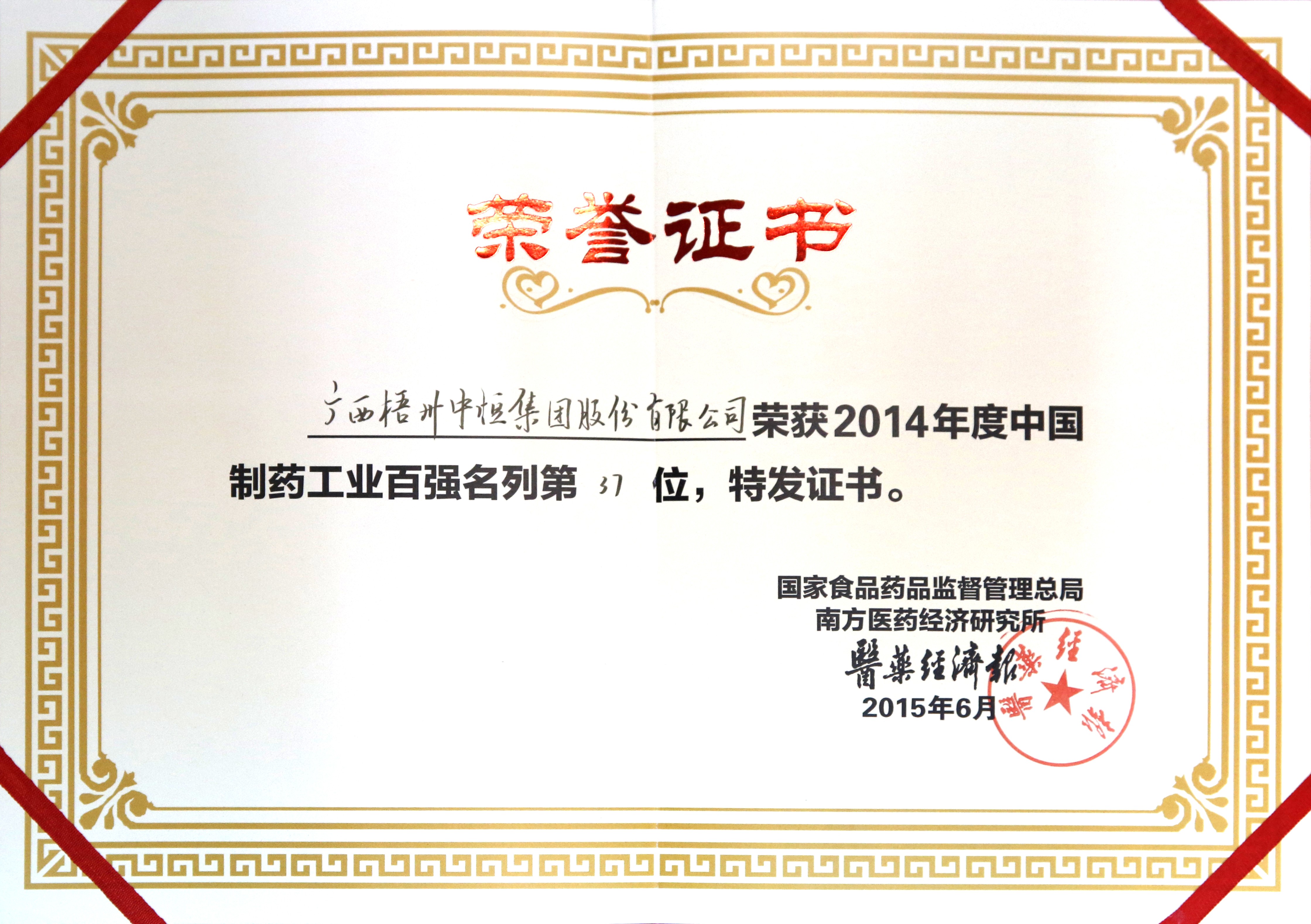 榮獲2014年度中國(guó)制藥工業(yè)百?gòu)?qiáng)名列第37位